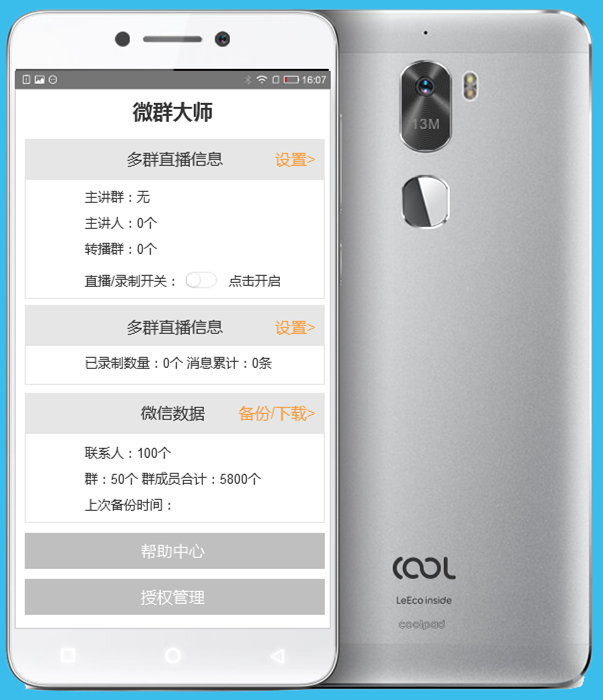 多群轉播是基于微信群的同步轉播工具,它用技術手段實現了多群語音轉播(包括圖片、文字、鏈接、轉拍小視頻等)。也就是說,如果您需要在幾十個群進行轉播講課,您只需要在一個群講課,然后通過使用多群轉播工具實時同步轉播您的語音、圖片、文字、圖文鏈接到別的微信群。這解決了含金量高的課程無法同步道所有微信群的問題,擴大了微信群講課的用戶覆蓋面。微群大師直播系統多群轉播是全網首家微信多群同步轉播平臺,提供在線微信群語音多群同步轉播服務,多群實時轉播,不限群數,不限時間,千萬群主轉播專屬基地。